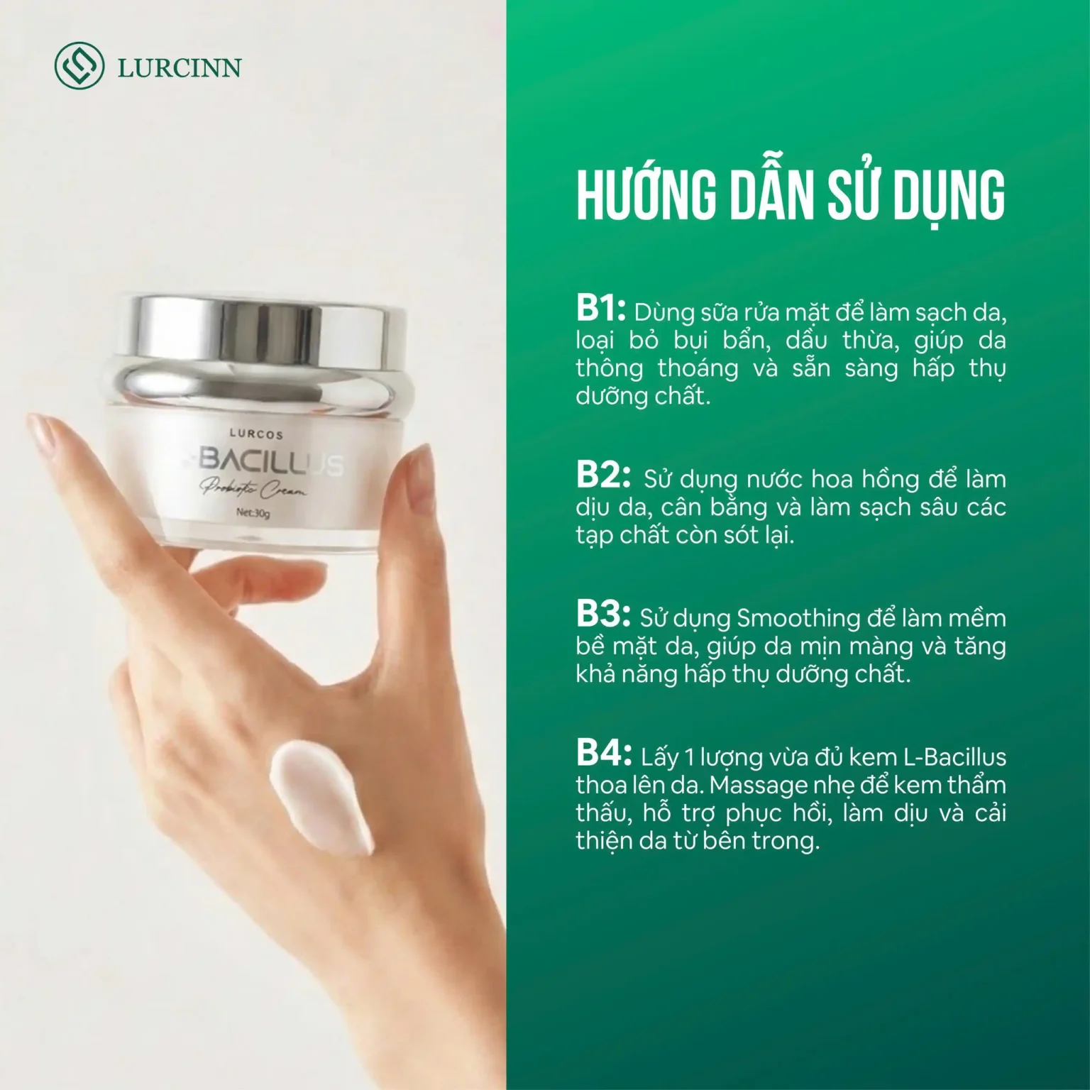 - Quy trình: Làm sạch da – Nước hoa hồng – Smoothing – L-Bacillus Cream.